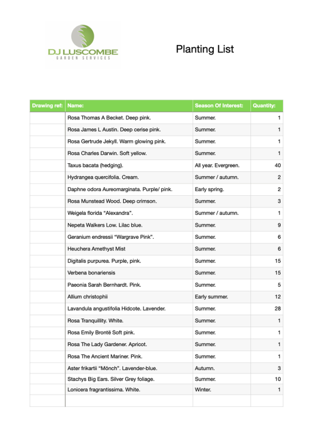 The completed scheme and plant list can be emailed to you, or sent as a printed document.