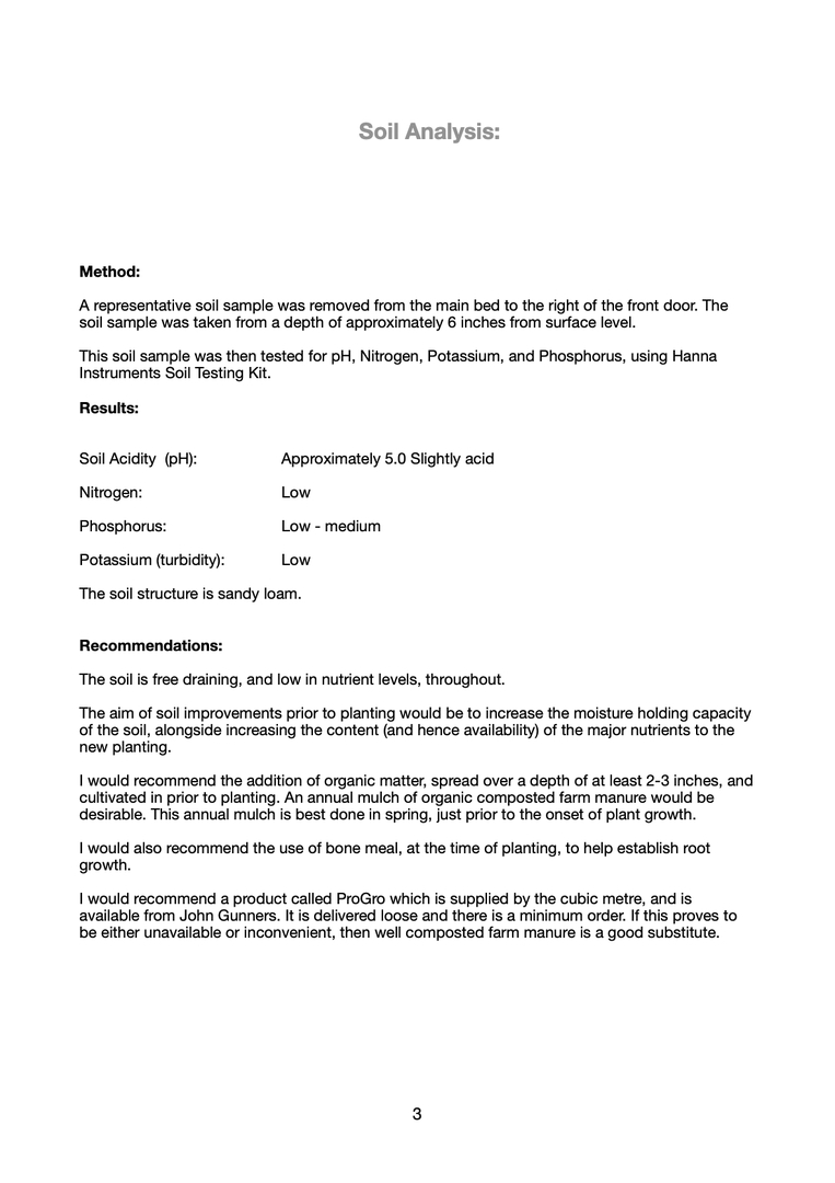 We can then arrange a time for us to visit. During this visit, soil samples will be taken, and these will be tested for nutrient levels, structure, etc. Detailed measurements will be taken of the areas to be planted, and the aspects of the beds noted.
